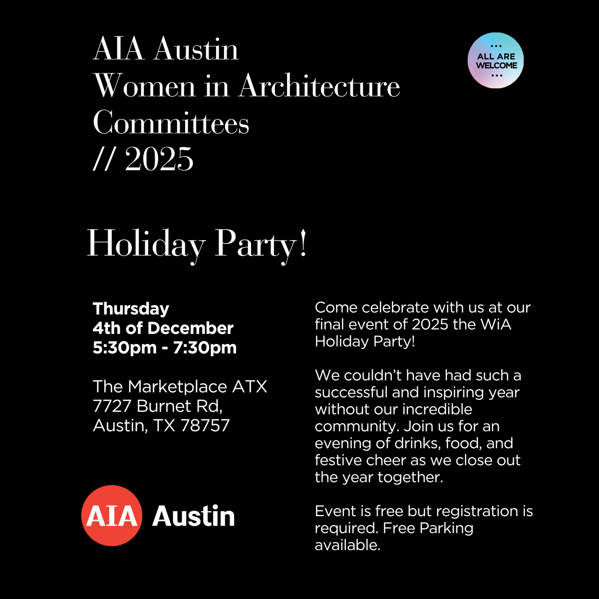 AIA Austin + El Paso Women in Architecture invites college students to join in a week-long series “WiA College Salon Series: What We Wished We’d Known Before Graduating Architecture School” of virtual webinars/panels on November 10-13! All are invited to attend our free virtual salon series and in-person networking event featuring topics curated specifically for … Continued
