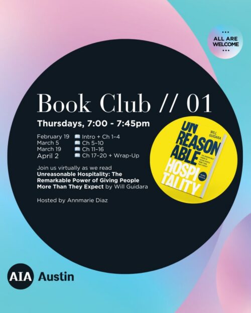 AIA Austin WiAβs first read of the year will be Unreasonable Hospitality: The Remarkable Power of Giving People more than They Expect by Will Guidara is a book about transforming ordinary service into extraordinary experiences by anticipating and exceeding customer expectations, applicable to any industry, not just restaurants. It uses stories from Guidara’s career, including his time at Eleven Madison Park, to illustrate how to create a “hospitality-first culture” through empathy, attention to detail, and empowering staff to create memorable moments, like arranging a surprise sledding trip in Central Park for a family. The book argues that this approach builds loyalty and improves business by making people feel seen, valued, and cared for. This session of the AIA Austin WiA is led by Annemarie Diaz.